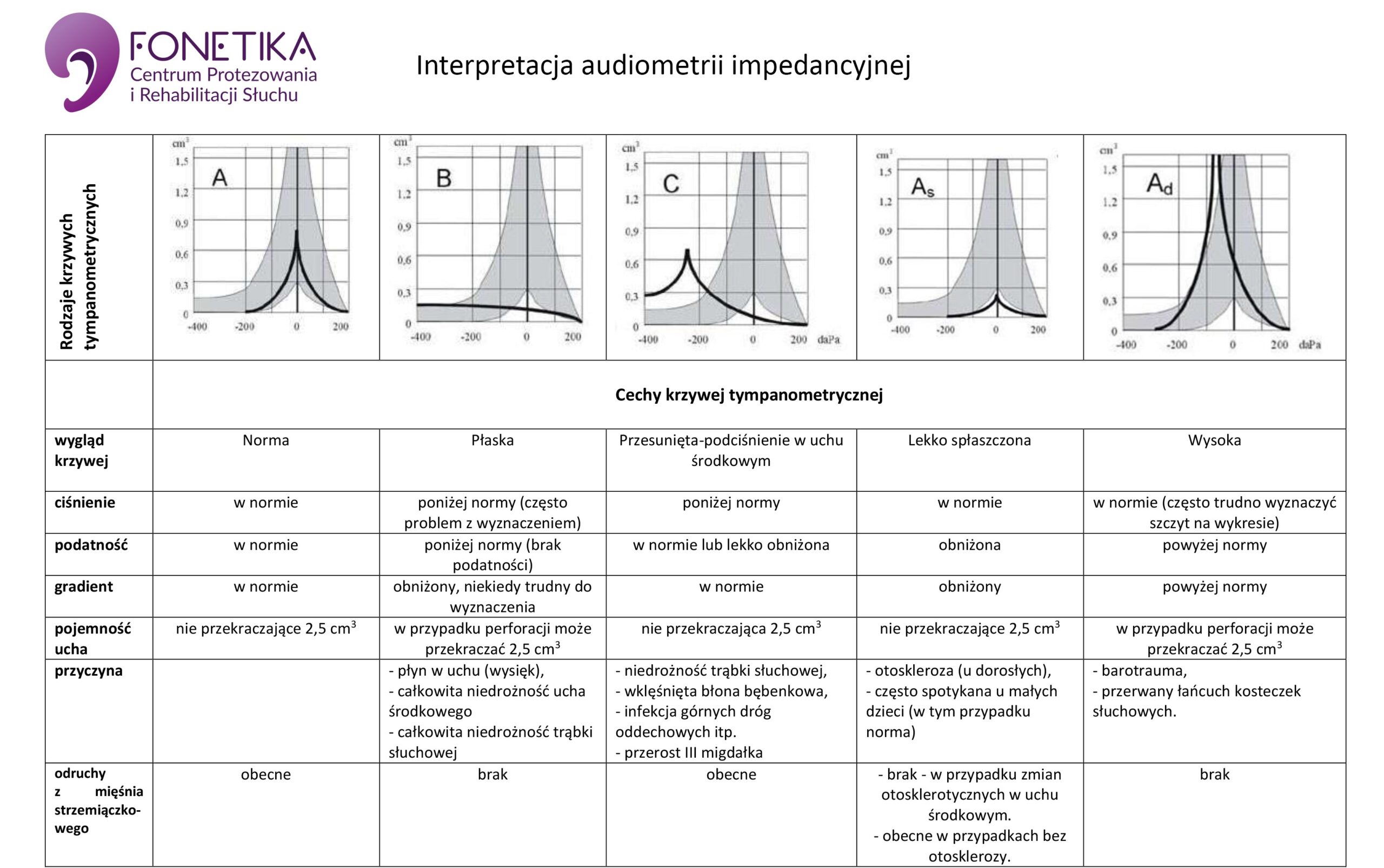 W zależności od rodzaju patologii (lub jej braku) wyróżniamy 5 podstawowych krzywych tympanometrycznych (tympanogramów). Zestawienie krzywych tympanometrycznych w tabelkach poniżej.