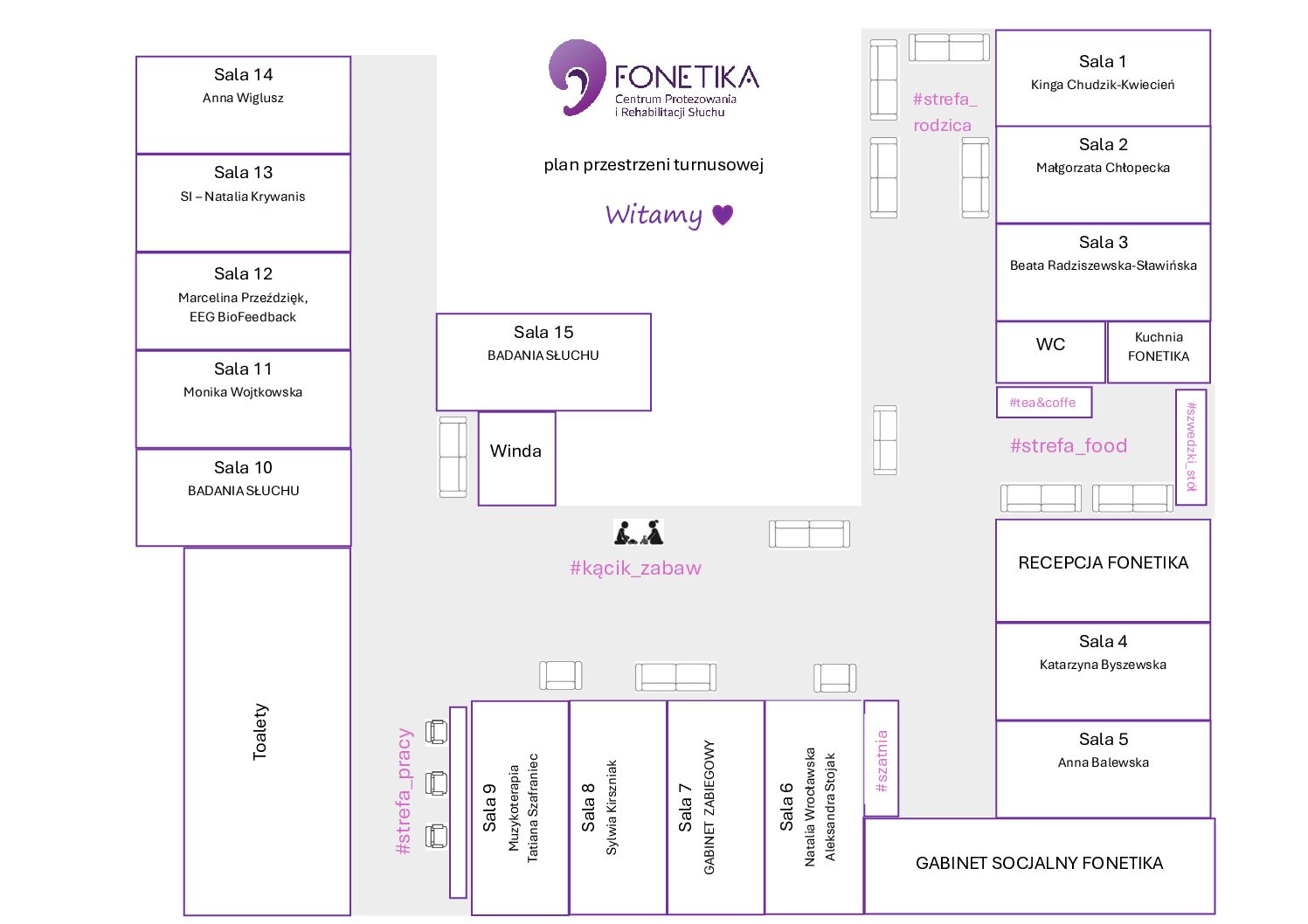 Aby każdy bez problemu znalazł swoją salę, udostępniamy Państwu plan przestrzeni turnusowej poniżej wraz z rozpiską sal oraz terapeutów 🙂